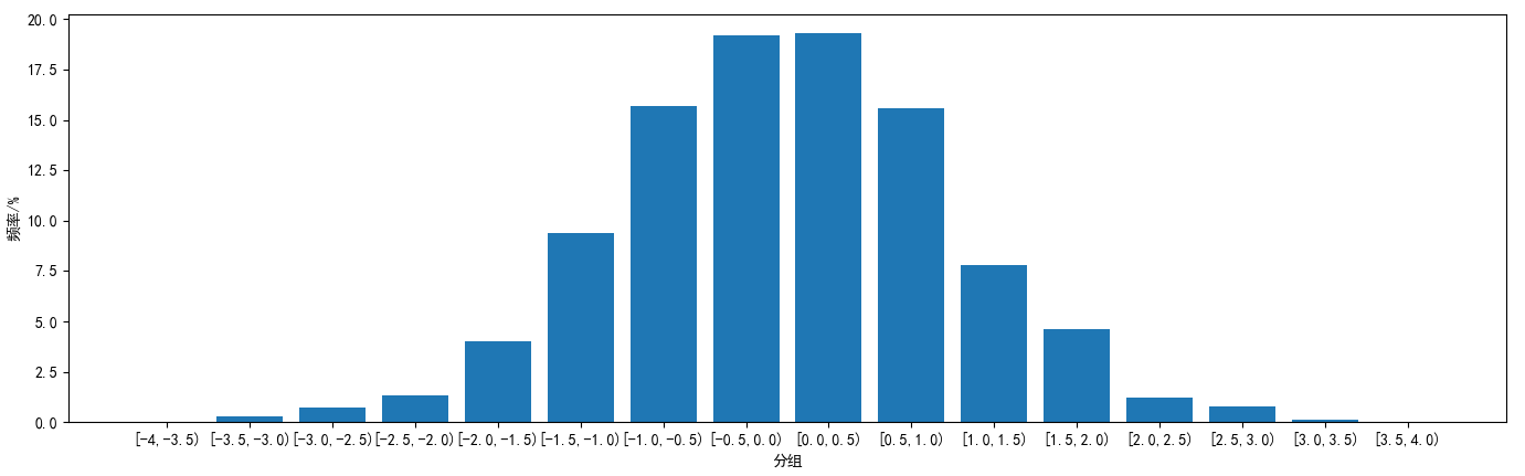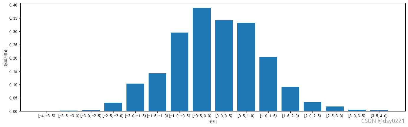 如果要绘制同样的直方图,但是要把纵坐标表示成频率或者频率与各组间距之比,需要先对数据进行分拣处理,然后以条形图(bar)形式输出结果。