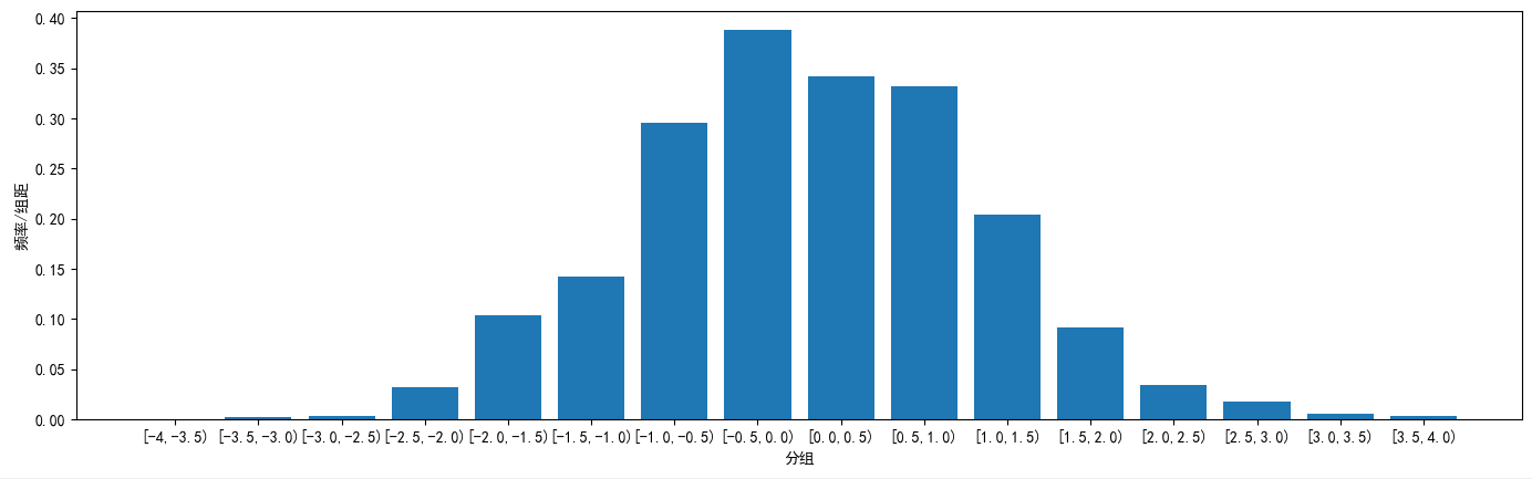 将上一节绘制直方图的代码“# 转换为频率”以下的部分改成下列代码,即可将纵轴设置为频率与各分组间距之比,即频率分布直方图: