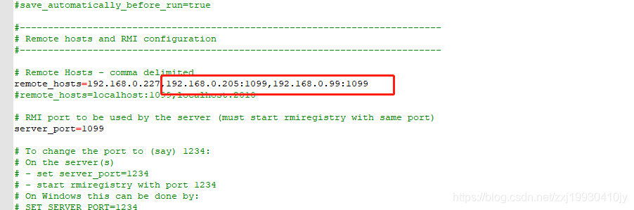 在jmeter.properties文件中新增remote_hosts配置,配置是slave主机的ip和slave,主机里安装的jmeter的端口号(默认端口是1099,可以修改)(可多台)