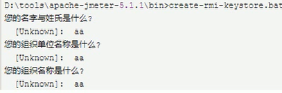 在master机器上jmeter.bin目录下命令下执行命令:create-rmi-keystore.bat,执行命令过程中会询问加密因子的填写,可以随意填写。再确认信息的时候输入“y”。最后在:输入<rmi>的密钥口令,直接回车