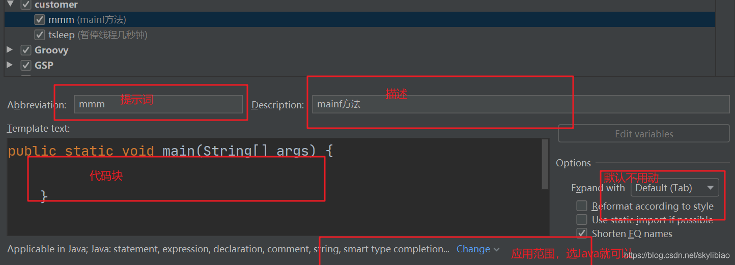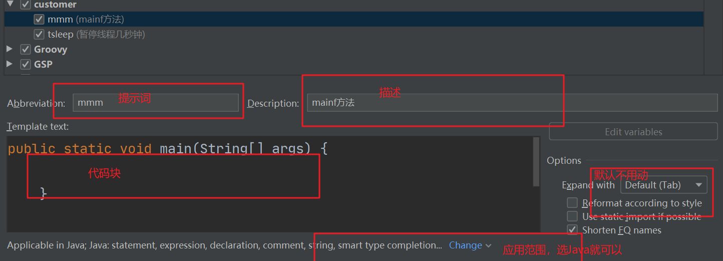 4.点击Live Template,就是模板制作。四个地方需要注意: