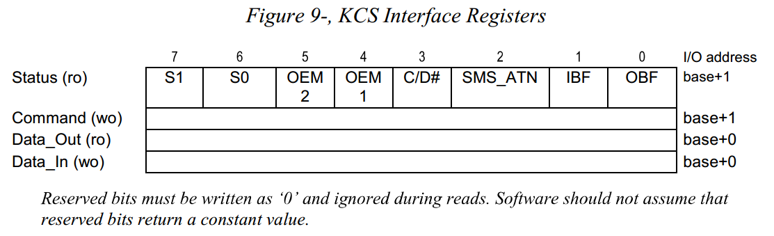 2、kcs的寄存器是在BMC里实现的,一共4个寄存器,每个寄存器1个字节。系统侧通过I/O访问这四个寄存器来达到操作kcs的目的。