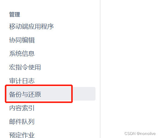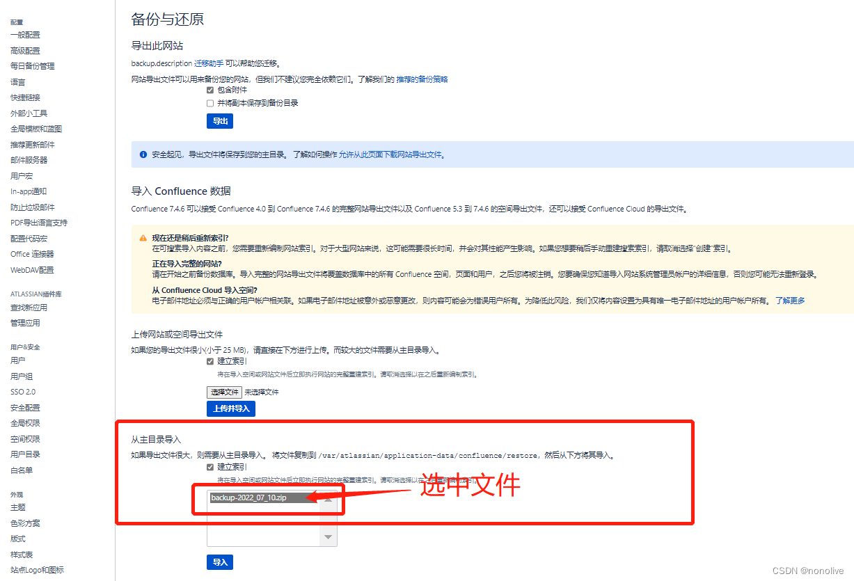 cp /var/atlassian_bak/application-data/confluence/backups/backup-2022_07_10.zip /var/atlassian/application-data/confluence/restore5.使用管理员账号登录Wiki,进入配置管理后台