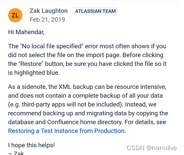 1.复制到restore目录下的待恢复的文件,需要有对confluence用户的完全的权限,不然点击导入的时候会报permission denied错误,可直接执行chmod 777 backup-2022_07_10.zip赋权限;