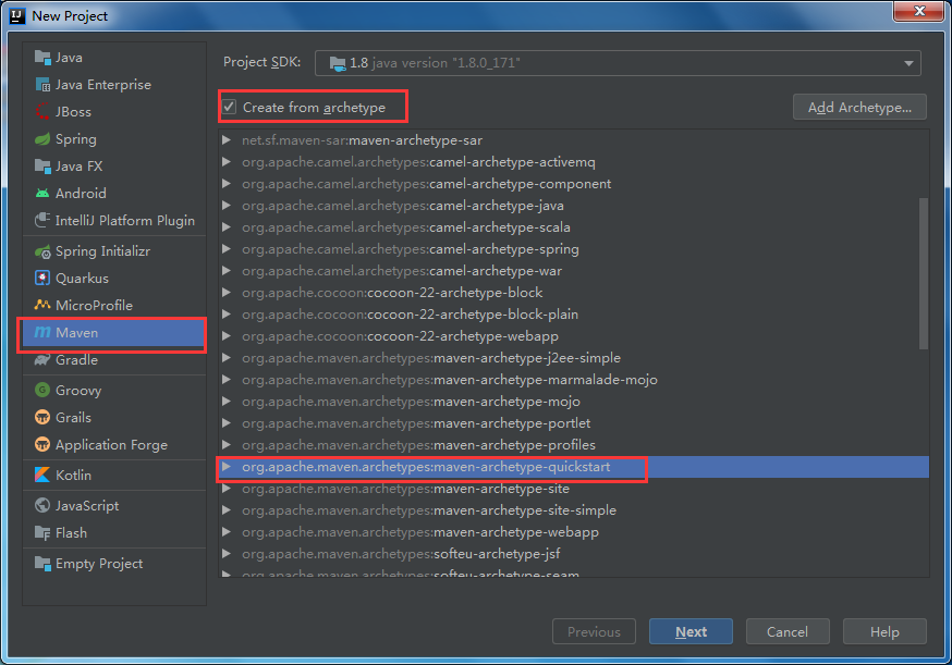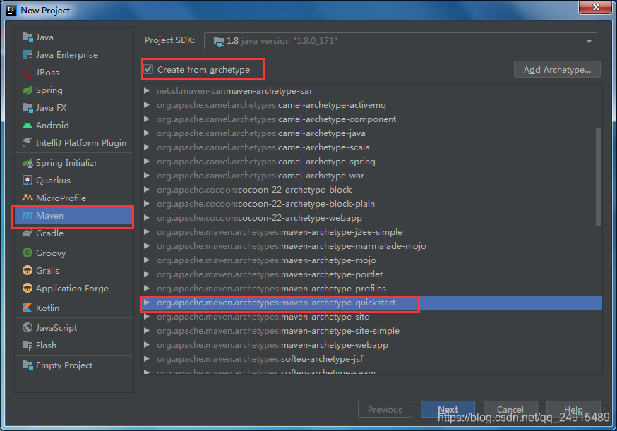 2.选择maven,勾选Creat from archetype,选择maven-archetype-quickstart,点击next。