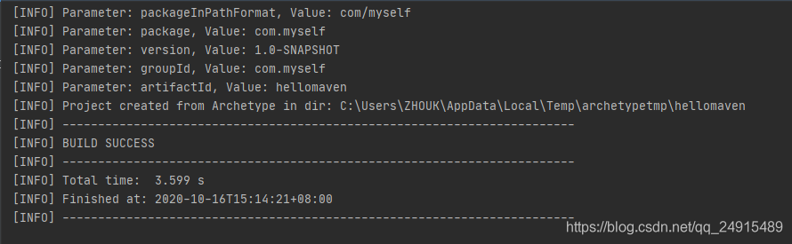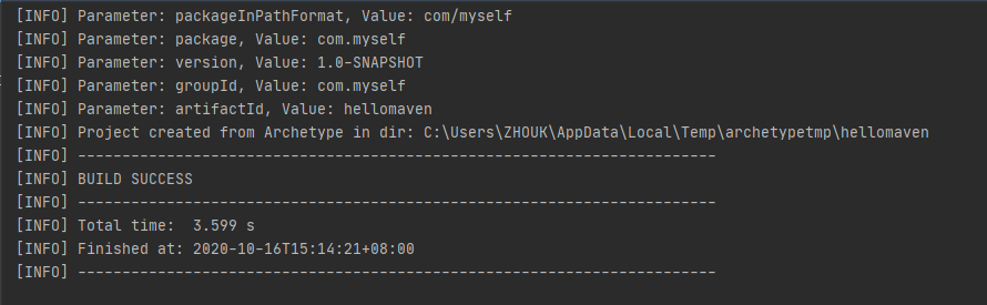 有时可能由于网络等其他原因,构建成功会出现,No archetype found in remote catalog. Defaulting to internal catalog.警告,这个警告可以不用管,并不影响使用。