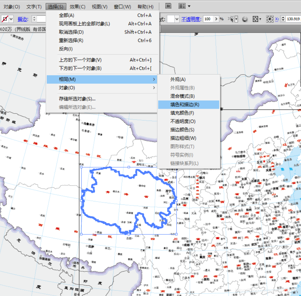 5、随便选中一个斑块,找到菜单栏【选择】→【相同】→【填充颜色】/【描边颜色】/【填色和描边】