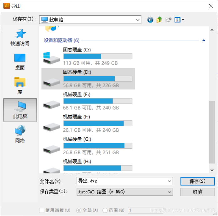 7、找到菜单栏,【文件】→【导出】,弹出以下对话框,选择导出文件格式为dwg格式: