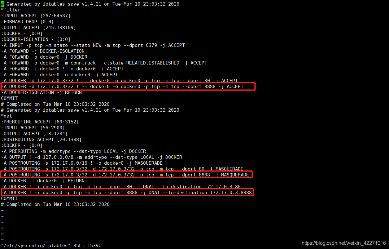 2、根据下图红色的三处示例添加需要映射的端口,然后重启iptables即可。(例如下图中,添加8888端口映射,8888 是容器对外提供服务的端口)