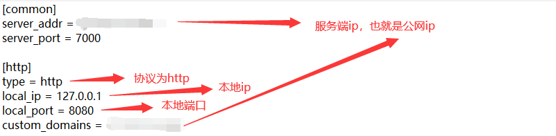 - 双击打开frpc.ini文件,加入以下信息,这里是能完成内网穿透的关键,也就是通过访问公网ip:port 此处为 xxx:8080可以访问win10电脑的8080端口