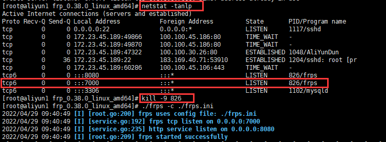 这是因为这个服务已经启动的意思,你可以通过 netstat -tanlp指令查询7000端口对应的PID,然后执行指令kill -9 对应的PID,杀死进程,然后再执行./frps -c ./frps.ini。