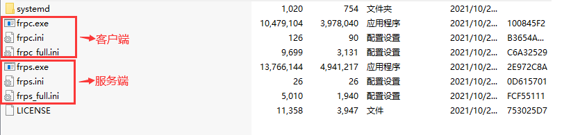 下载的frp包中都会含有两类文件:客户端文件frpc命名的,c对应的是client的意思;服务端文件frps命名的,s对应的是server的意思。