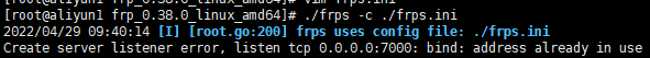 1. 如果你运行./frps -c ./frps.ini之后发现配置错了,就去再次修改frps.ini文件,再次运行./frps -c ./frps.ini,提示如下错误: