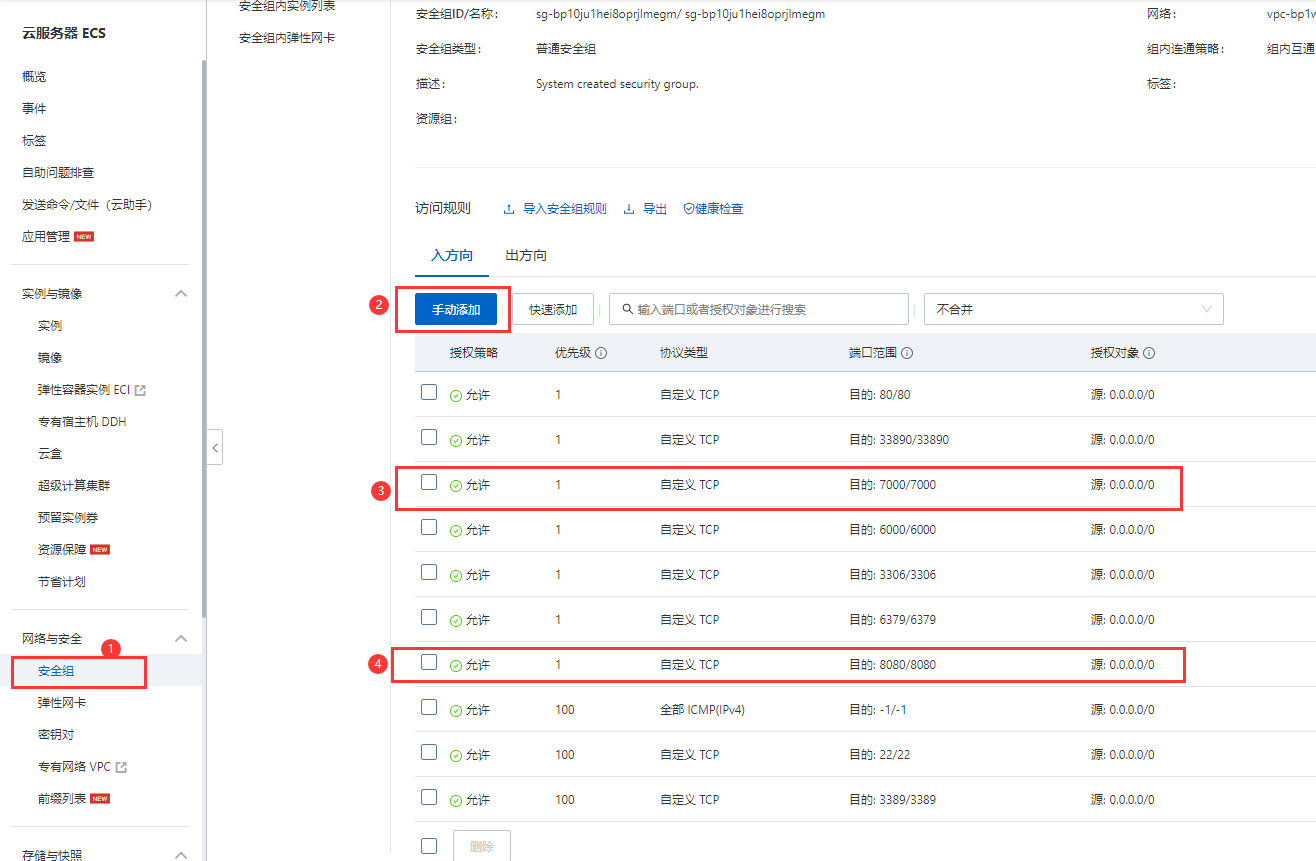进入服务器控制台,找到安全组,然后按照以下步骤手动添加要开放的端口号。