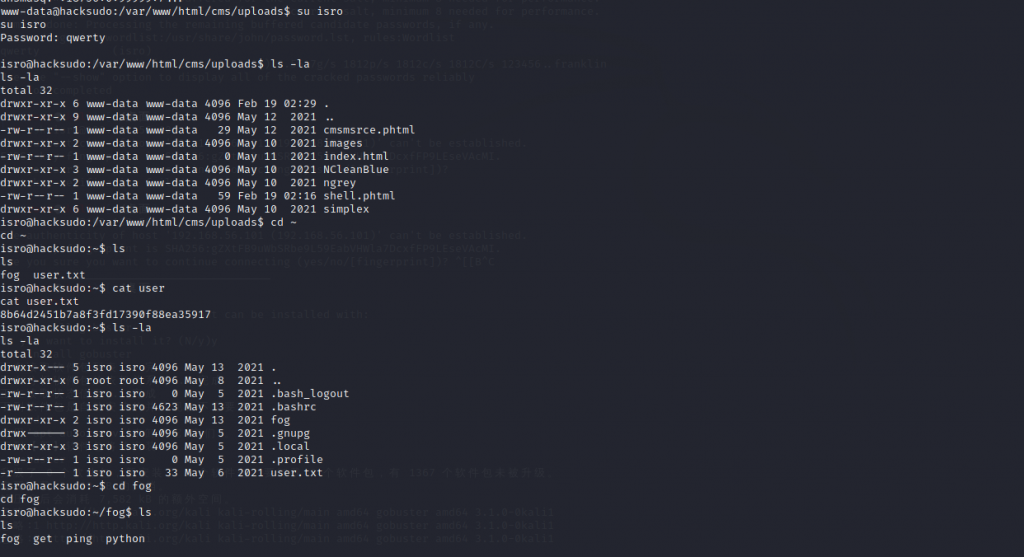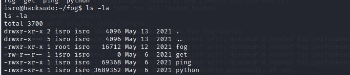 登录isro用户,进入fog目录,找到了一个root用户的可执行文件。
