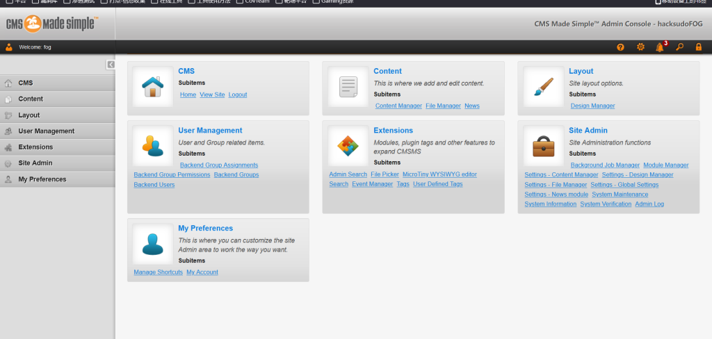 wwww.localhost/fog Username=fog:password=hacksudoISRO得到用户名密码,尝试登陆一下系统: