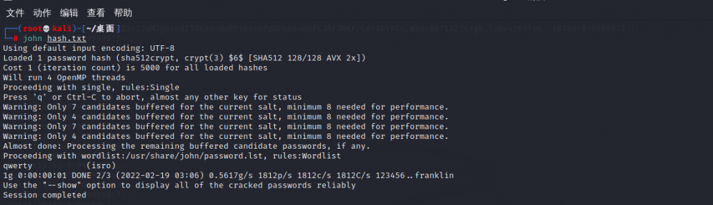 查看 /etc/shadow文件,破解isro用户的密码