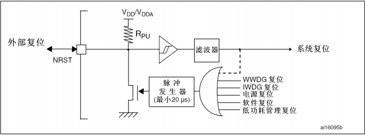 芯片内部的复位信号会在NRST引脚上输出,脉冲发生器保证每一个(外部或内部)复位源都能有至少20μs的脉冲延时;当NRST引脚被拉低产生外部复位时,它将产生复位脉冲。