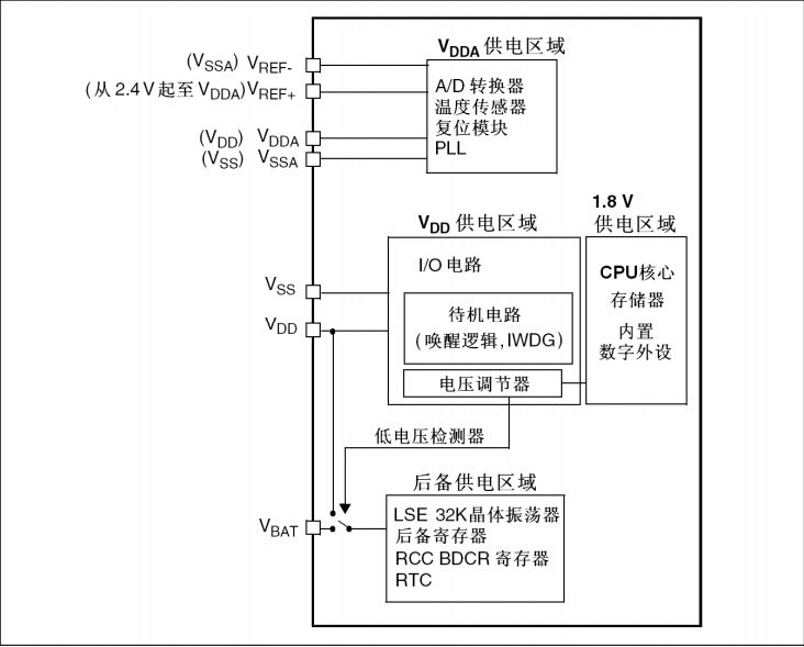 - 在VDD和VBAT两者掉电的前提下,VDD或VBAT上电将引发备份区域复位。
