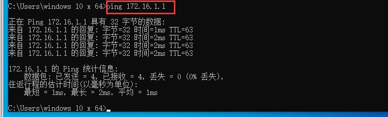 2、配置pc(windows10)的IP地址和对应网关并检验是否能ping通对应网关: