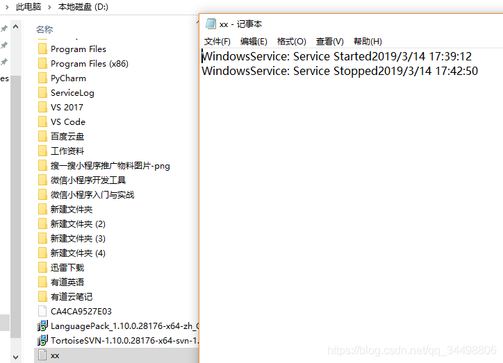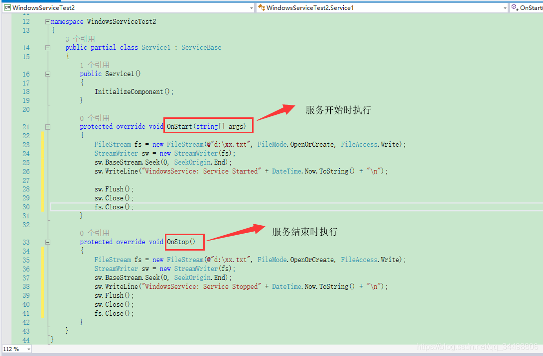 3、向服务的函数中写功能,在这里,当启动和停止服务时,向一个文本文件中写入一些文字信息