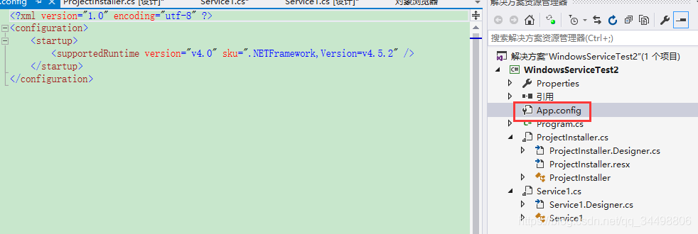 1、使用windows自带的 InstallUtil.exe 工具安装, InstallUtil.exe 的位置一般为:C:/Windows/Microsoft.NET/Framework/v2.0.50727 或者 C:\Windows\Microsoft.NET\Framework\v4.0.30319 中,具体安装哪一个看你项目使用的.NETFramework的版本,具体在你创建的服务中的App.config 文件中查看: