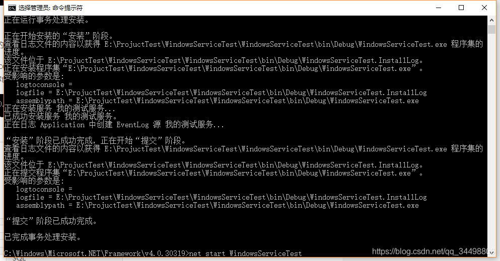其中 path 是你的服务即:WindowsServiceName在本地硬盘的路径,WindowsServiceName.exe是你创建的服务生成的可执行文件,WindowsServiceName.exe 的位置是在你创建的工程的 bin/Debug 路径下,注意:path 路径中的文件夹名字中不能带空格