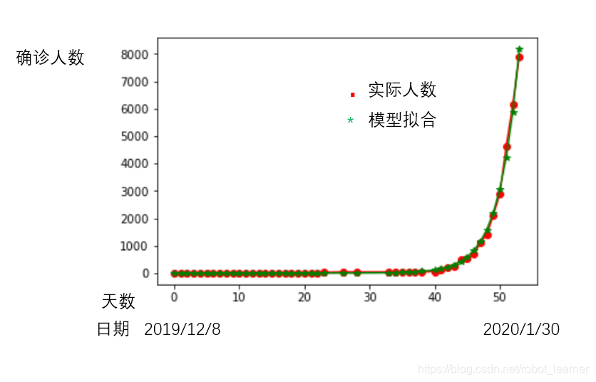 根据各大新闻媒体的报道,从2019年12月8日的第一起报道算起,截至2020年1月30日的新型肺炎累计确诊人数大概8000人。下图反映了每日累计确诊数量变化情况,和指数模型拟合的结果: