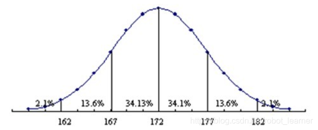 上图显示该地男性身高均值为172cm, 标准差 δ为5cm左右。 基于这两个数字,我们可以算出,该地随机找出一名男性,身高在172cm和177cm之间概率为34.1%。
