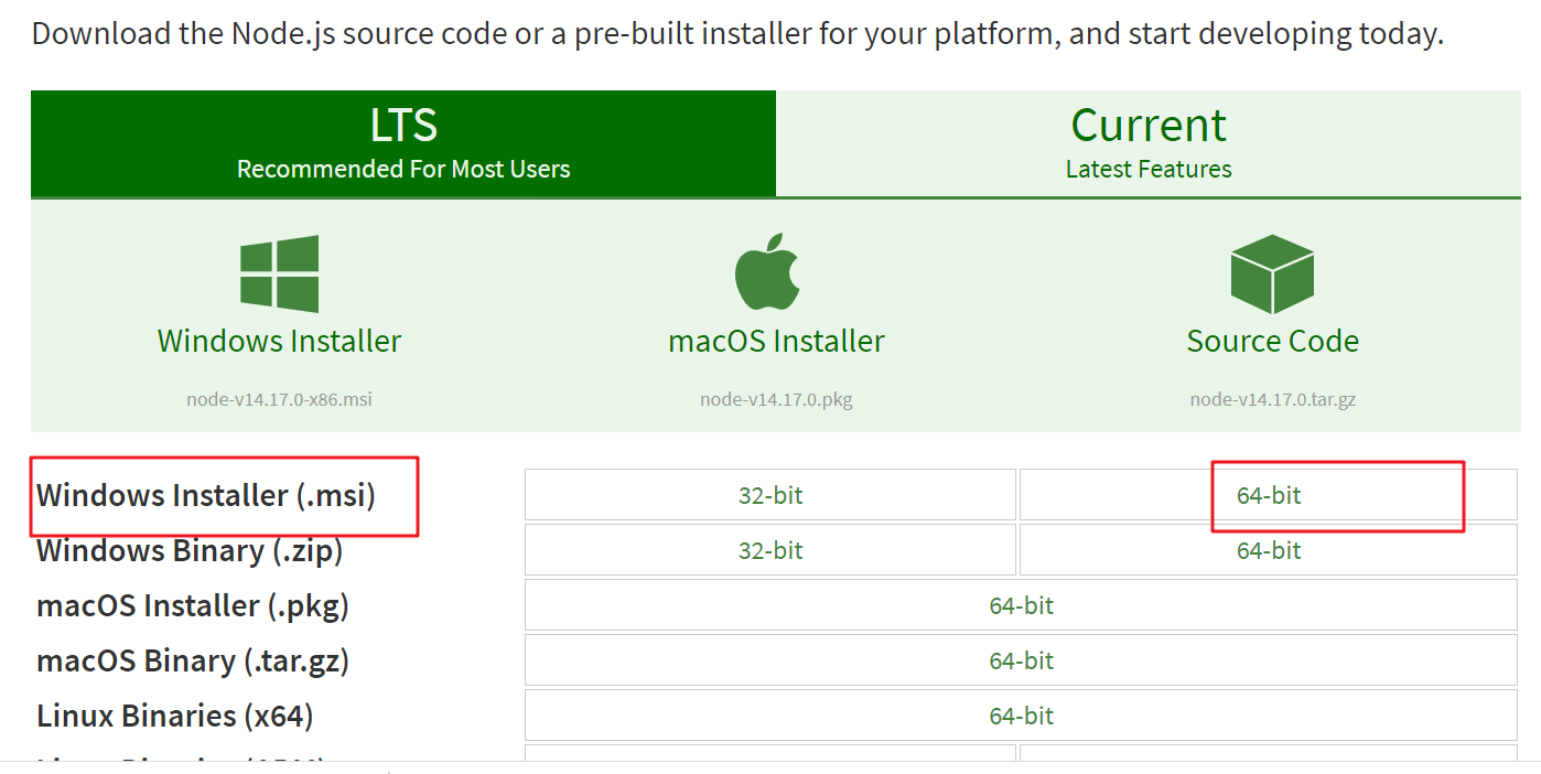 1.去node.js官网 https://nodejs.org/en/download/ ,根据电脑系统选择相应的下载