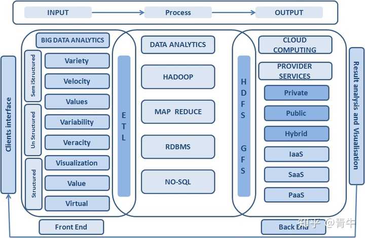 抽象而言,各种大数据技术无外乎分布式存储 + 并行计算。具体体现为各种分布式文件系统和建立在其上的并行运算框架。这些软件程序都部署在多个相互连通、统一管理的物理或虚拟运算节点之上,形成集群(cluster)。因此不妨说,云计算是大数据的基础。