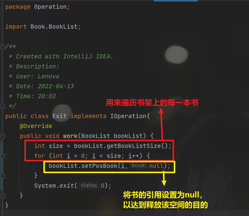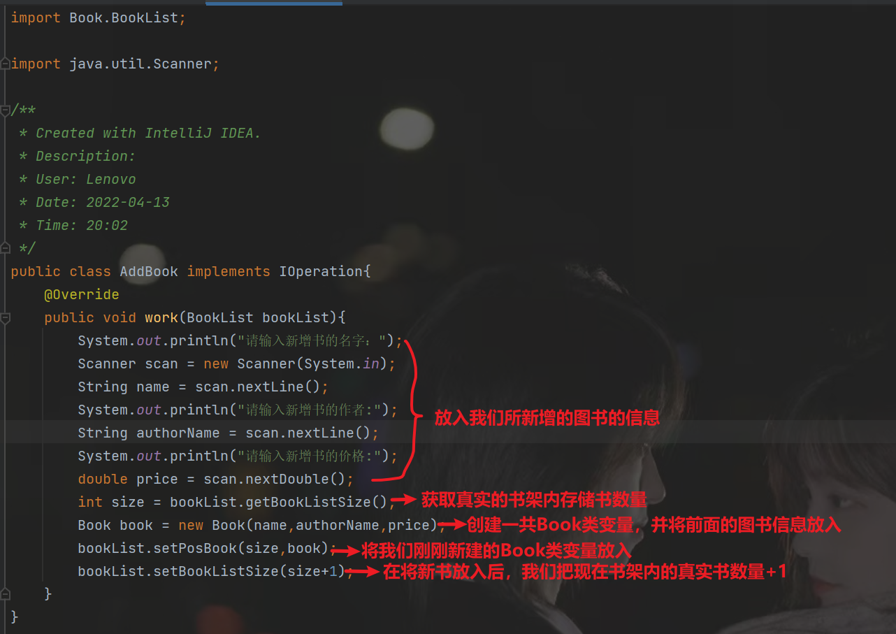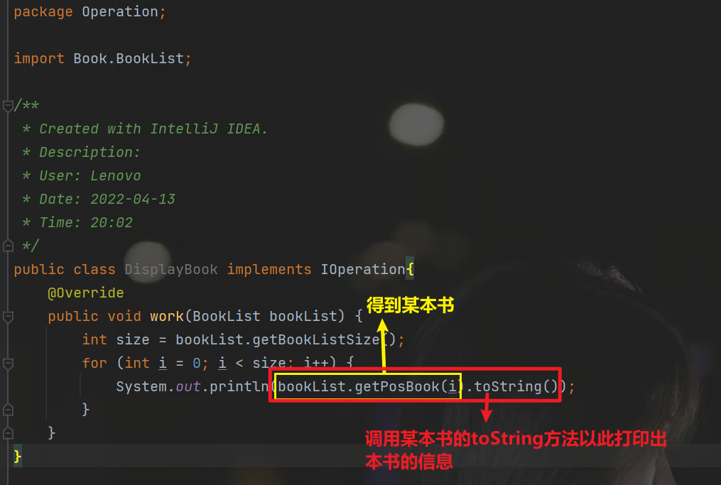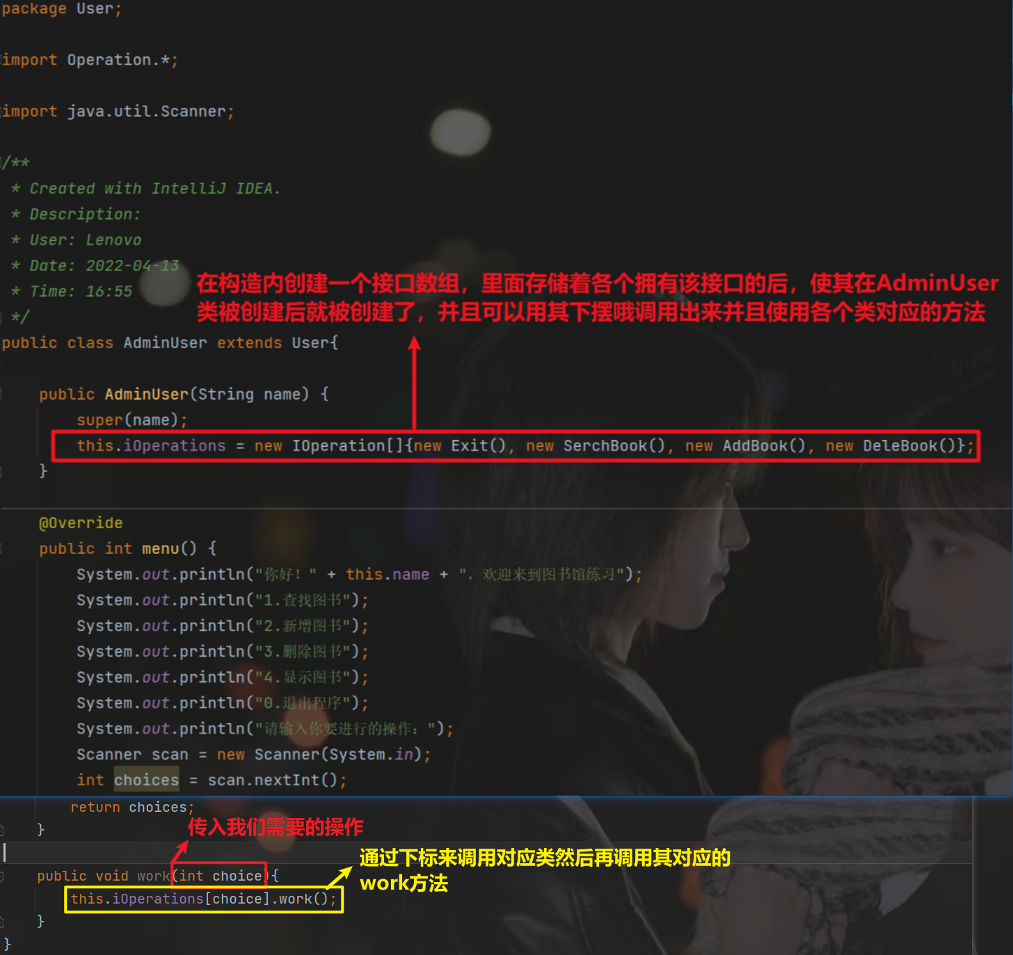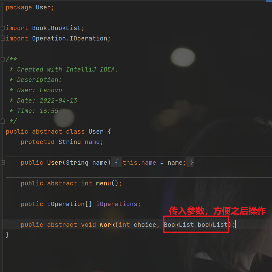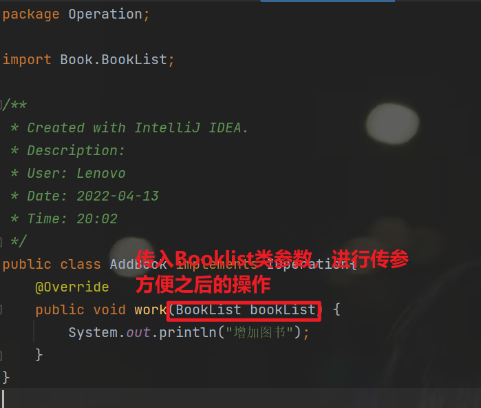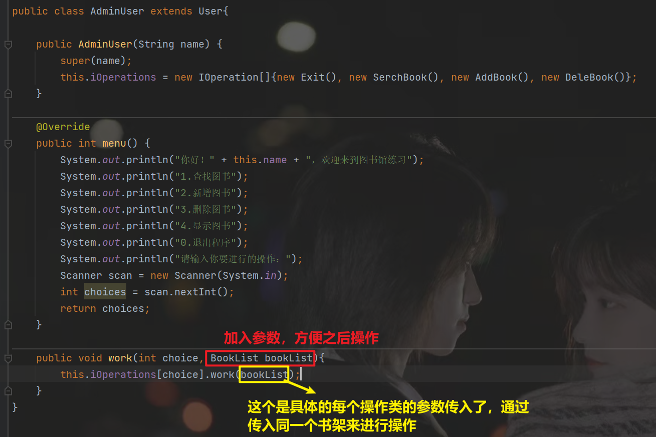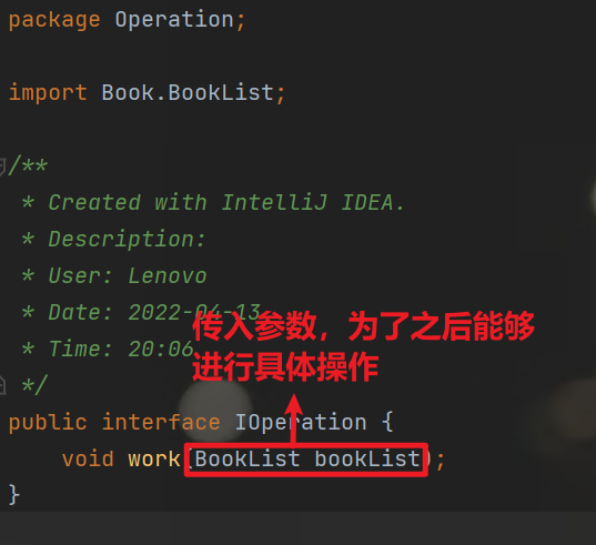 我们知道,无论是管理员还是普通用户的操作,都是对图书的增、删、查、改等操作,二这些都是需要在外面创建的BookList类上进行操作的,只有真正拿到了BookList类,我们才可以通过BookList类来调用任一Book类进行操作。所以,要在我们调用对应的work方法时,也应该将BookList类作为参数传进去。