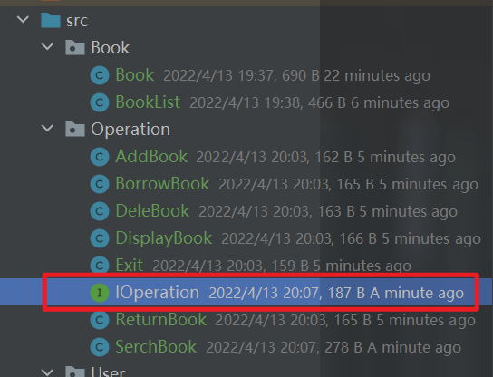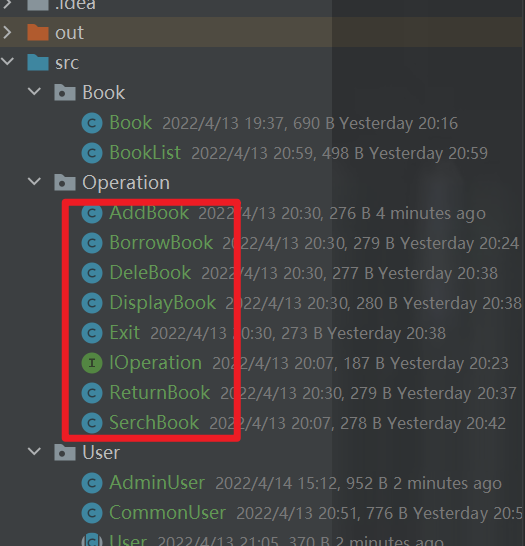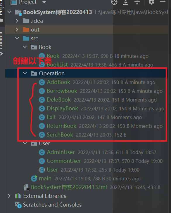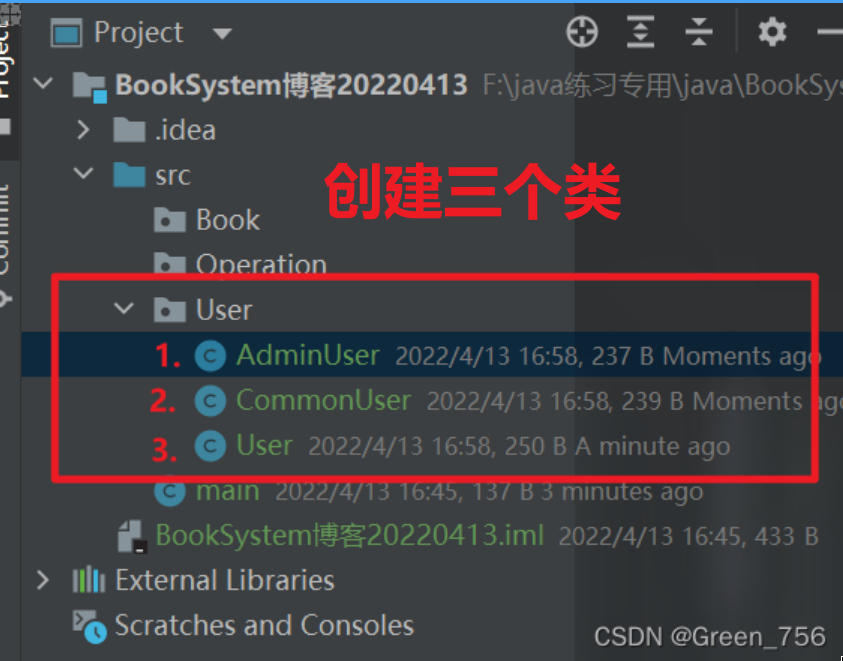 在前面的分析过后,我们可以创建三个文件分别为 ①User ②Book ③Operation,并创建一个main类来将所有程序串联起来,如图: