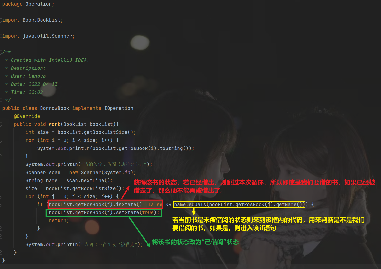 我们要借出这本书首先要先找到此书(可以借鉴前面的SerchBook类中的代码)。然后在找到我们的书以后我们需要得到该书的借阅状态,若为false则为未借阅,反之true则为已借阅。为了得到书的借阅状态,我们需要在Book类中加入下面代码:
