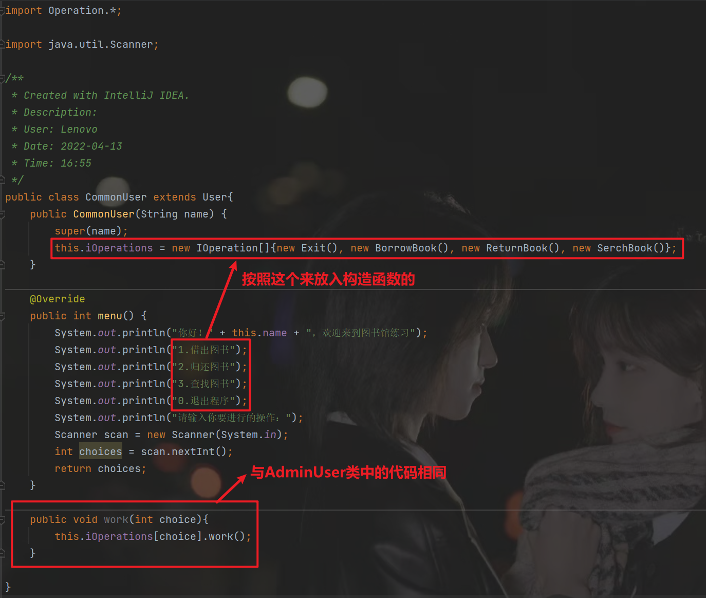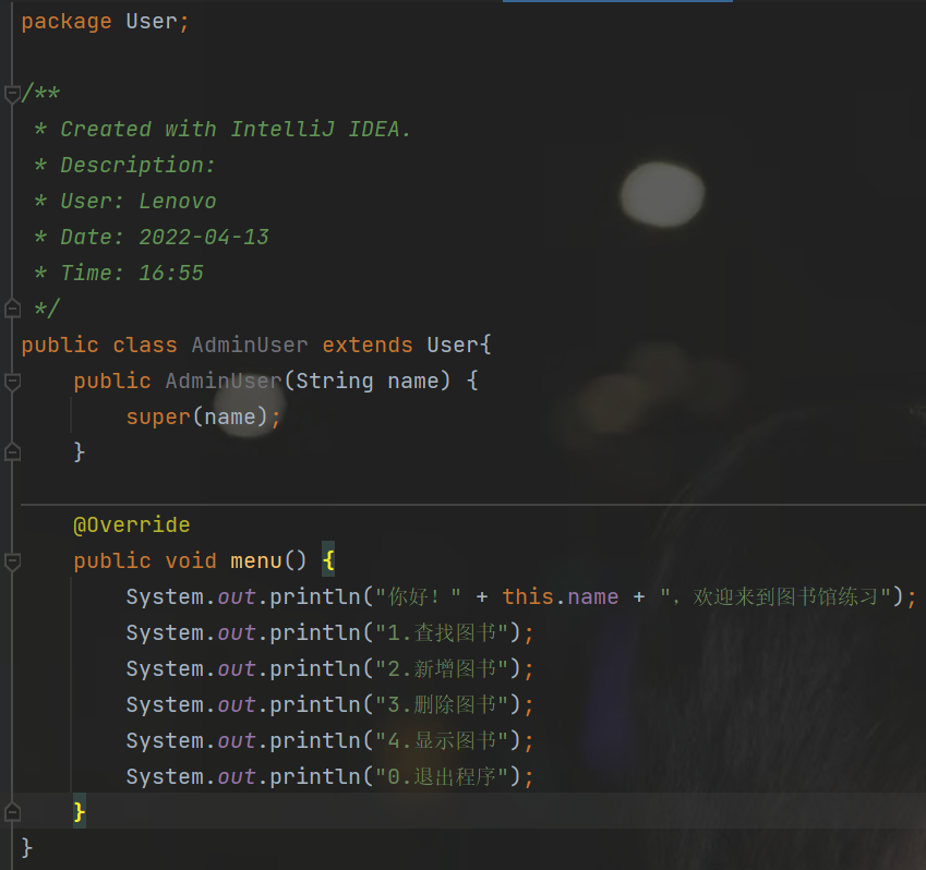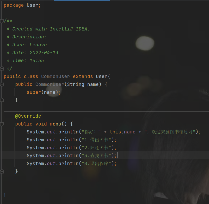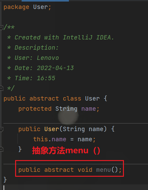 普通用户与管理用户在我们创建之后都会打印出对应的操作菜单,都有共同的这个功能,所以我们要在父类中先创建一个menu方法,但我们进一步思考会发现:其实当我们选择用户类型之后都是直接使用AdminUser的menu方法或者是CommonUser的menu方法,根本不需要用到User的menu方法,所以在这里,我们可以将User类变为抽象类,于是对应的AdminUser类与CommonUser类用到要将抽象方法menu重写,如下: