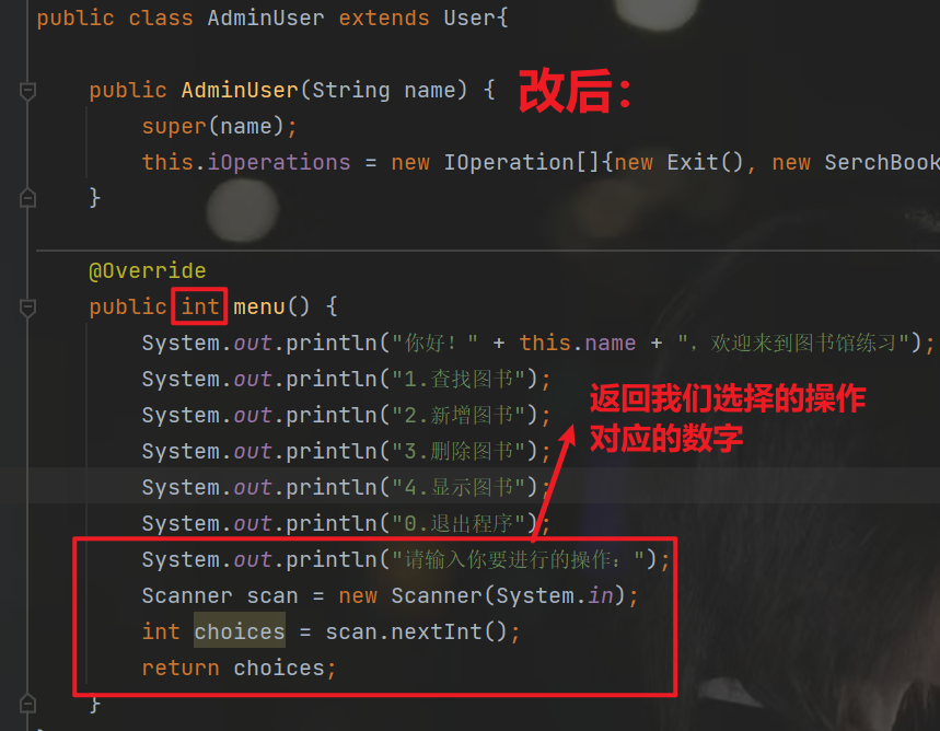 首先我们要接收我们输入的功能数字,才能知道要执行什么功能,所以要将menu方法的返回值改为int型,这样才可以接收我们输入的功能选择。以下是我们新增加的代码。