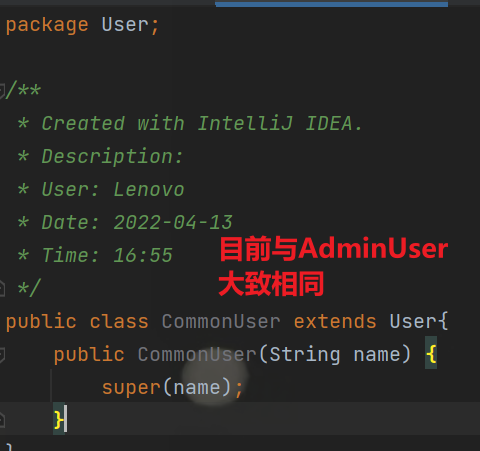 在实现用户前,我们需要创建有一个父类User,然后创建其子类AdminUser和CommonUser,理由有以下两点: