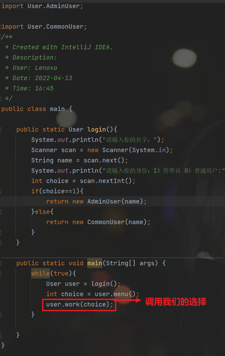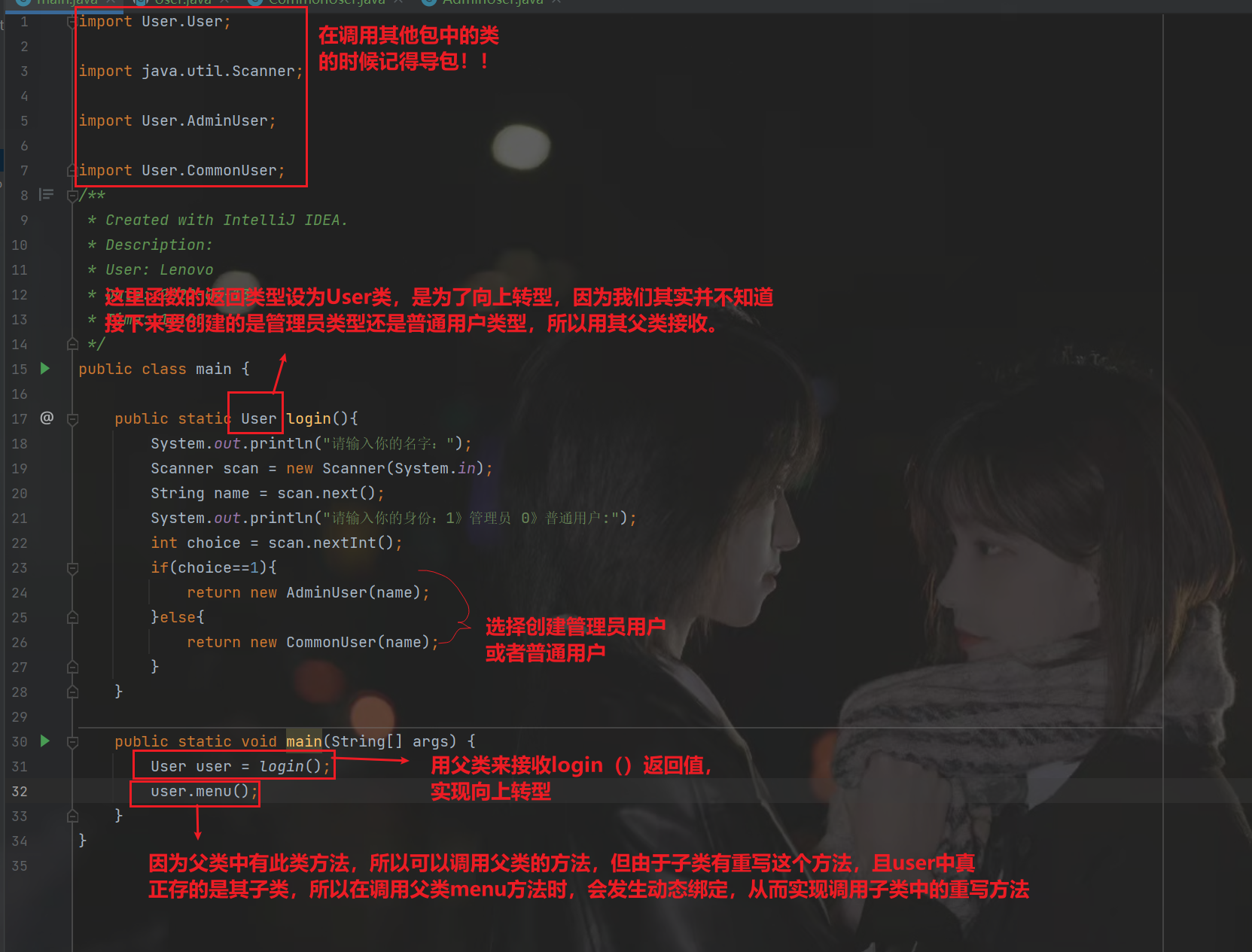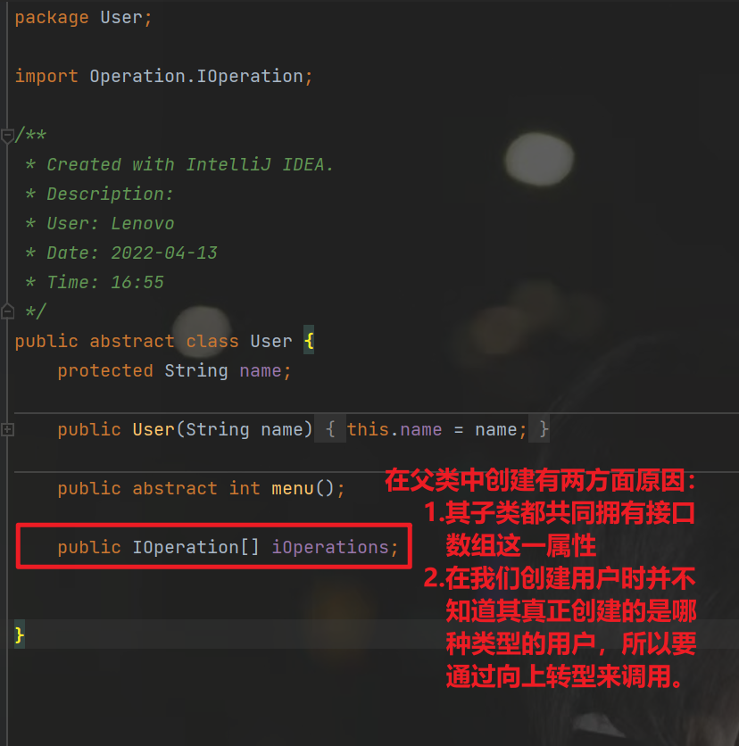 ①我们都知道用户是根据我们的选择来创造的,在我们未选择前是无法知道该用户是普通用户还是管理员用户,所以我们必须得先创建一个父类User,在我们选择了用户类型之后再创建对应的子类的管理员类型或是普通用户类型,然后再用父类通过动态绑定来实现对应功能。