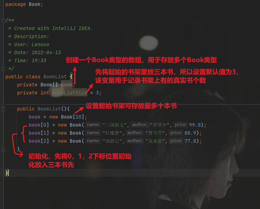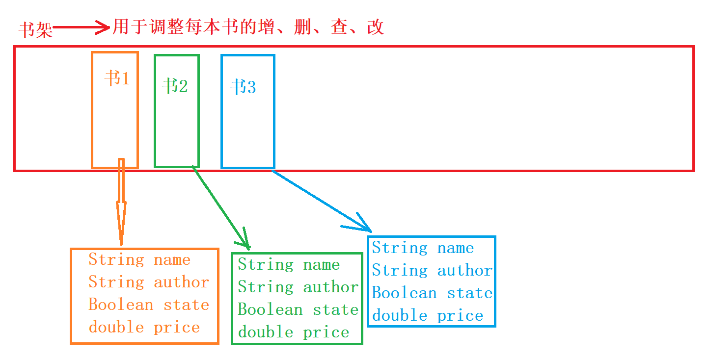 对于书,首先是每本书都拥有自己的信息,如:书名、作者、借阅状态、价格;其次我们可以看到管理员与普通用户可以做到对书进行增删查改等一系列操作。要实现这两个方面,我们就需要创建两个类:一个是Book类,另一个是BookList类。我们可以用下图来理解Book类与BookList类的作用: