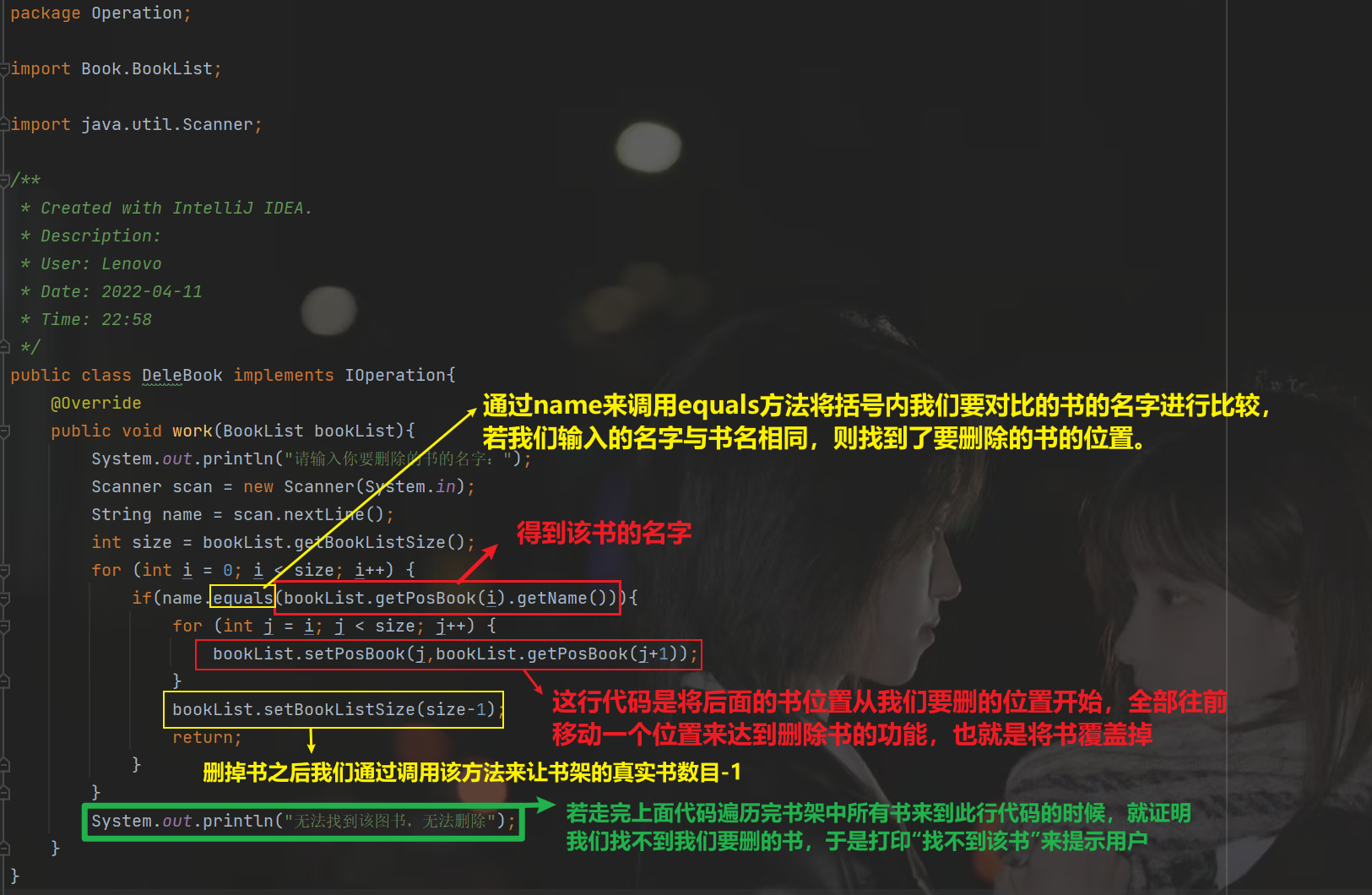我们是通过输入书的名字来找到我们要删的书,所以在这里需要得到书的名字,于是在Book类中需要再加多一个方法使我们能够得到书的名字: