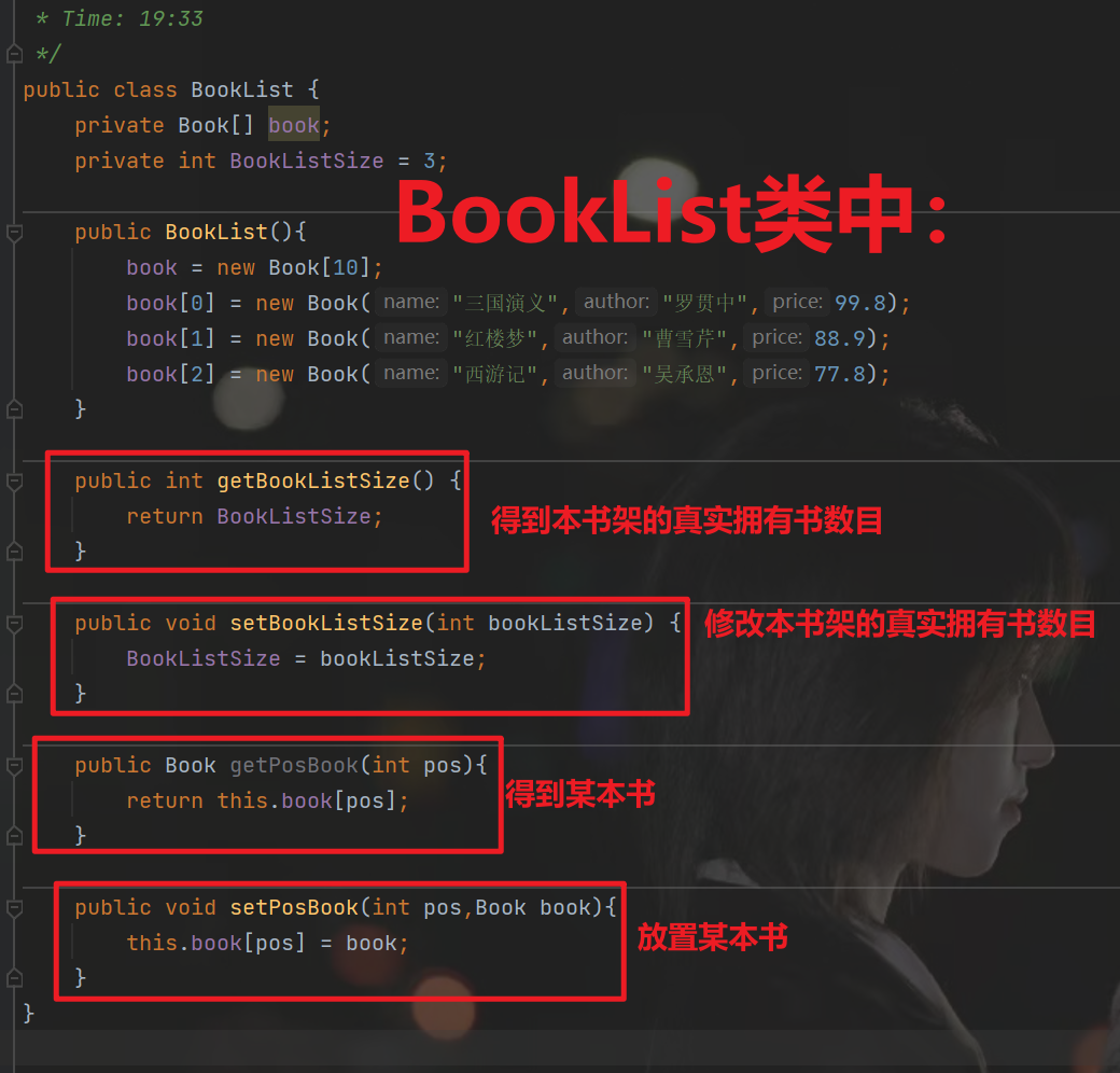 在进行正式操作前,我们在前面的BookList类中将BookListSize的访问修饰符设置为了private类型,所以要写方法将BookListSize得到,并且我们可以先写两个方法:其中一个用来得到某位置图书,另一个方法用于放置指定位置的图书,如下:
