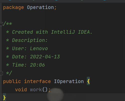 这个接口是作为所有功能调用的一个总开关,我们先在接口中写下work函数,然后再在各个类implement此接口后再重写work函数,此时我们的目的只是为了能够实现调用功能,所以先将work函数都设置为返回类型为void的无参方法。