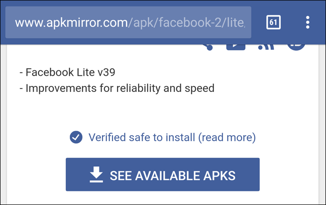 APK Mirror is a repository of verified Android APK files—everything on the site is checked for authenticity and safety. Select the latest version of Facebook Lite from the list beneath the description.
