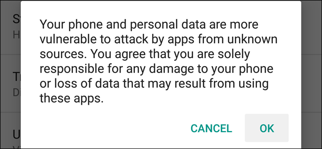 Tap the option labelled “Unknown Sources.” Tap “OK” on the warning that pops up.