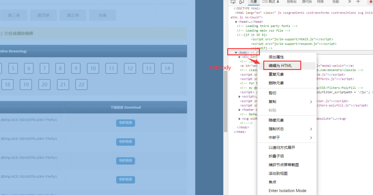 实现将网页多条磁力链接一次性全部下载环境:edge浏览器、迅雷1、找到磁力网页,如图,包含多条磁力2、按f12,进入调试模式 3、找到body,右键选择编辑为HTML4、找到磁力链接处,全选即可实现下载多条磁力链接 版权声明:本文为qq_37936305原创文章,遵循CC 4.0 BY-SA版权协议,转载请附上原文出处链接和本声明。原文链接:https://blog.csdn.net/qq_37936305/article/details/122471530