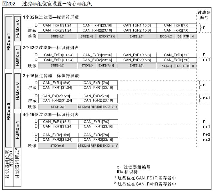 详见STM32F10X参考手册,图202,过滤器组位宽设置-寄存器组织