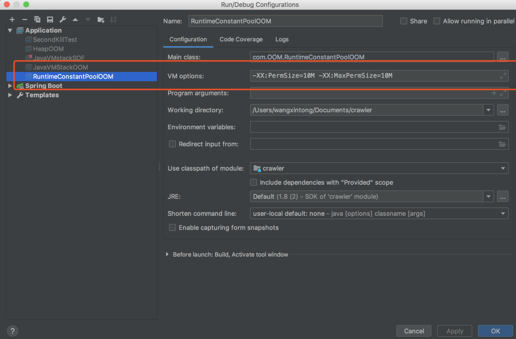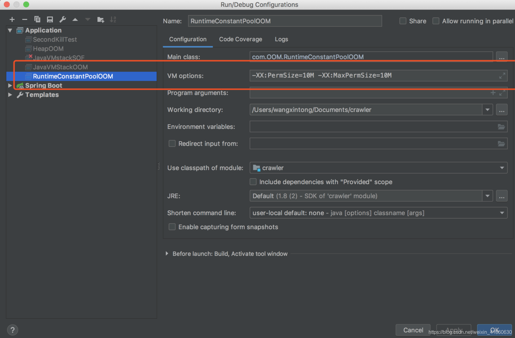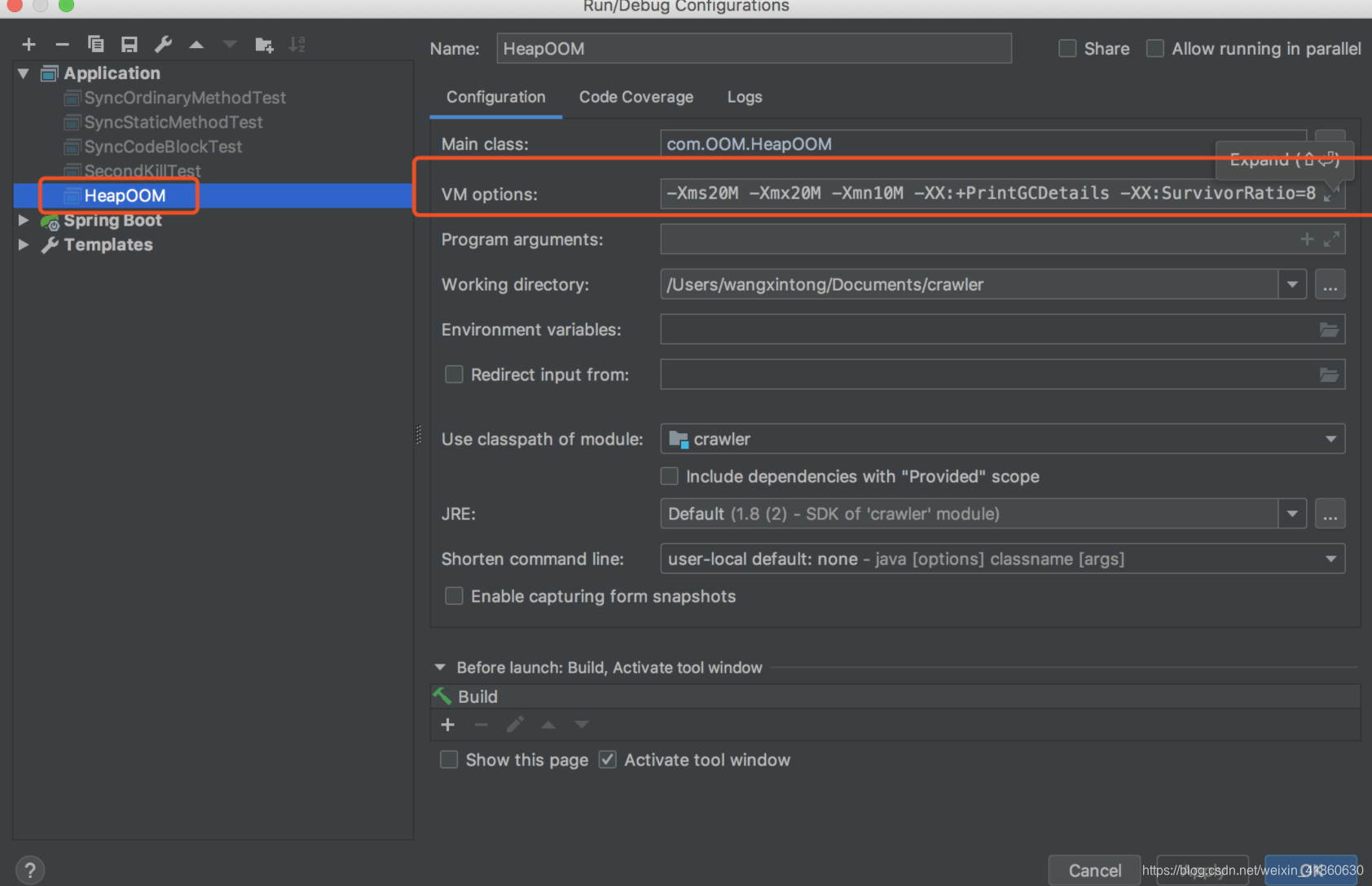 首先,限制Java堆的大小为20MB,不可扩展(将堆的最小值-Xms参数与最大值-Xms参数设置为一样即可避免堆自动扩展),通过参数-XX:+HeapDumpOnOutOfMemoryError可以让虚拟机在出现内存溢出异常时Dump出当前的内存堆转储快照以便事后进行分析。 以下是在Mac下使用idea设置虚拟机参数: